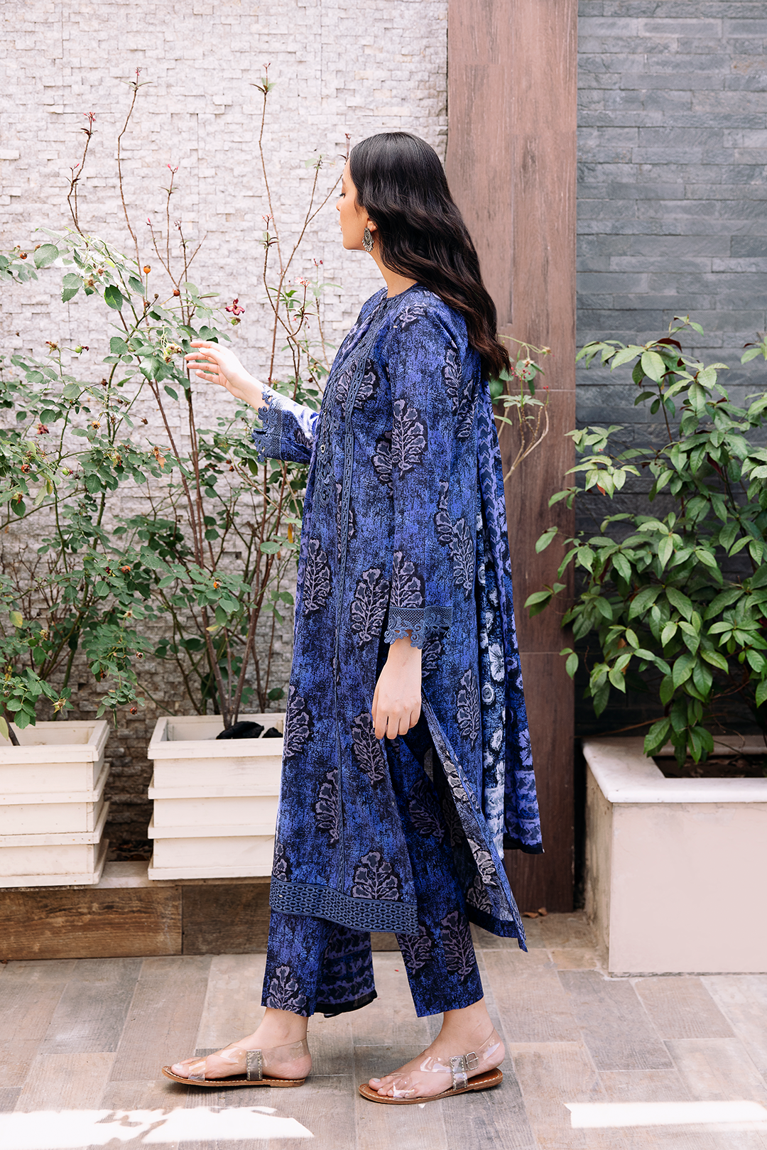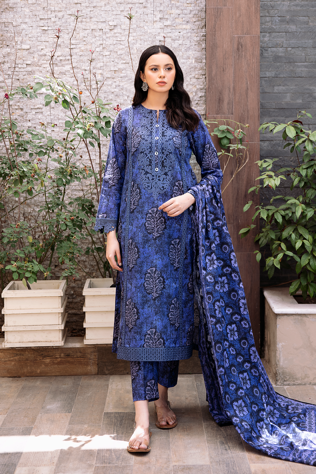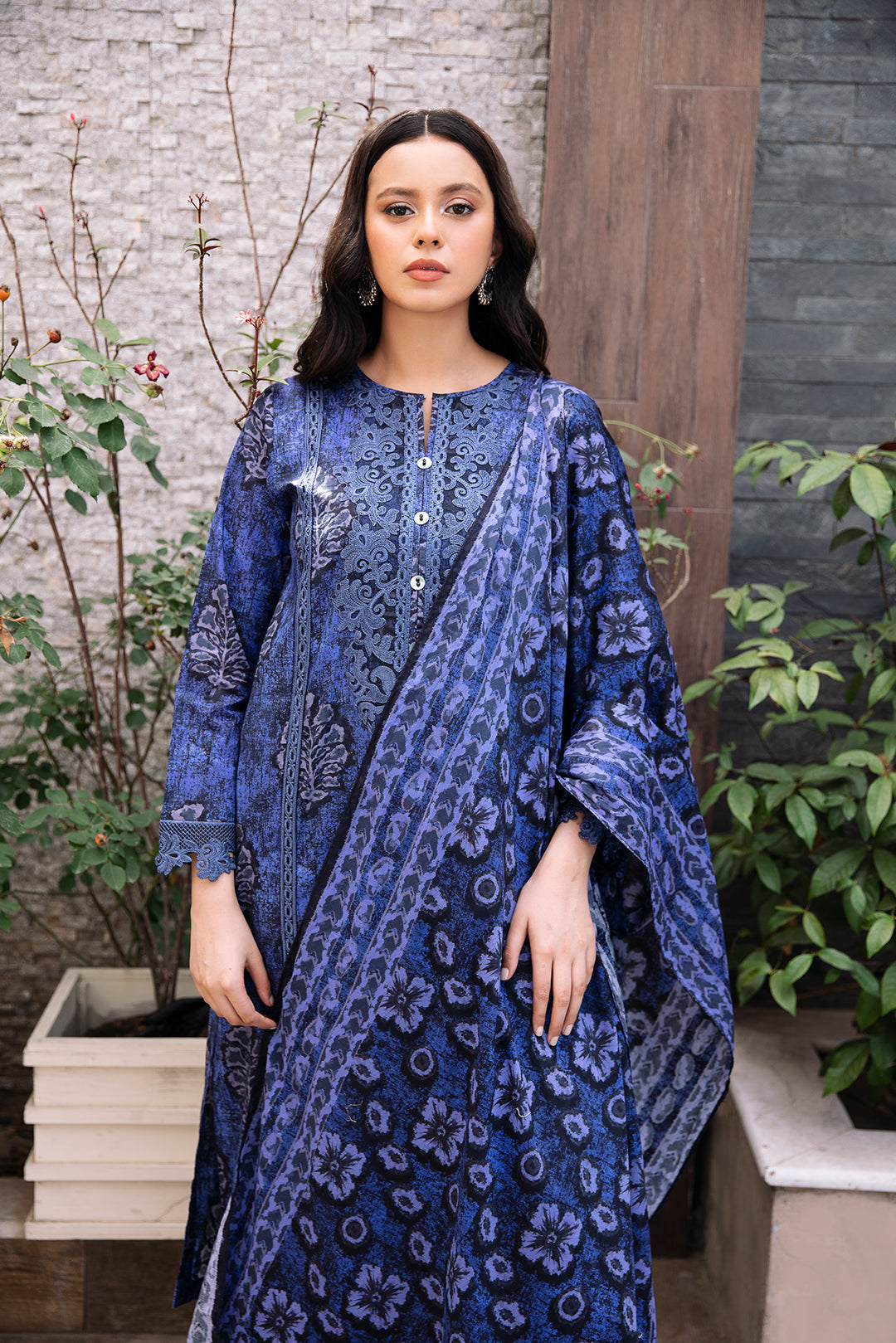 Radiate effortless charm with Azure, a deep cerulean outfit adorned with botanical motifs and intricate detailing that echo timeless sophistication. The matching printed dupatta flows gracefully, adding depth and harmony to the entire look. Featuring a buttoned neckline and delicate lace accents, this ensemble is a refreshing choice for daytime elegance.