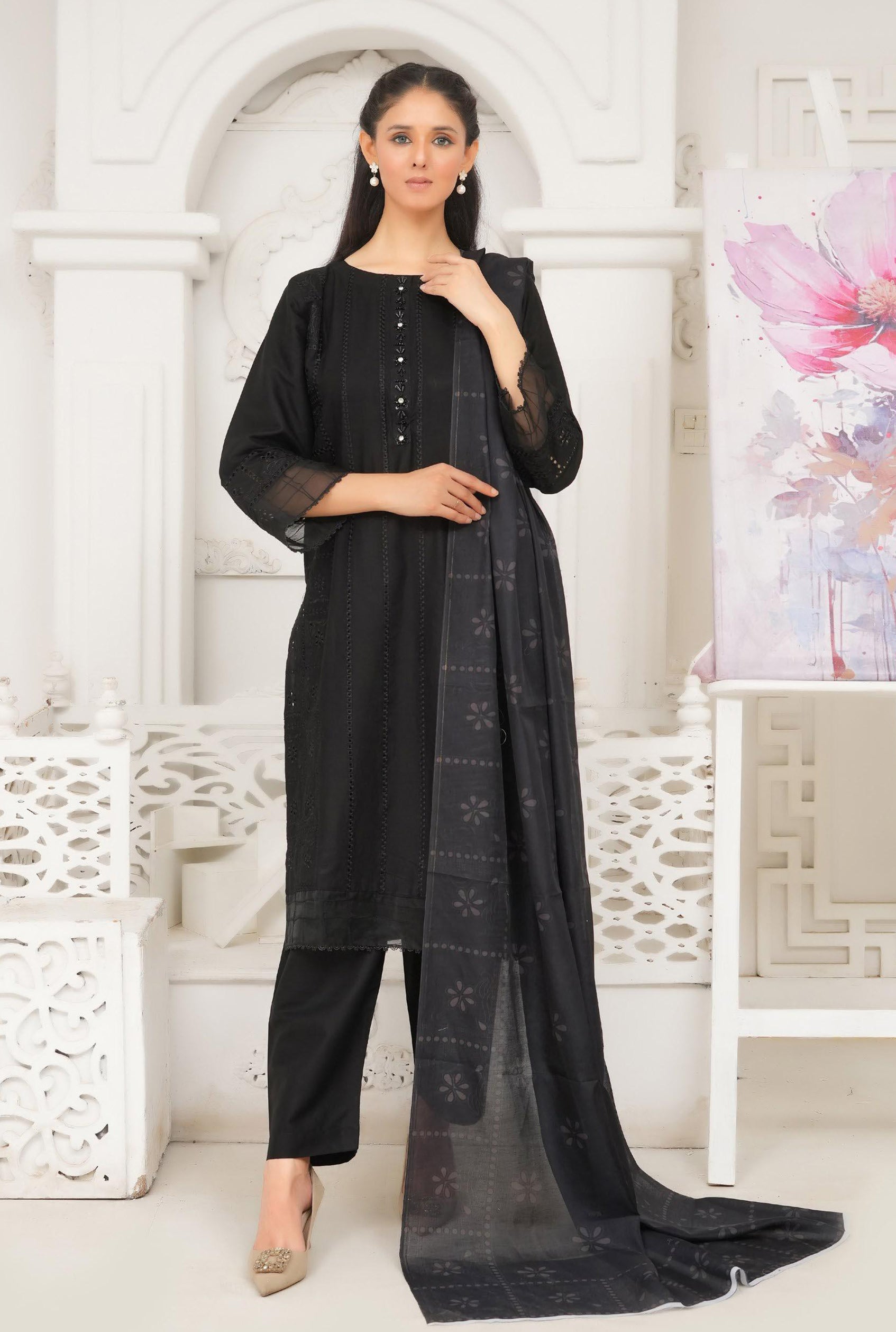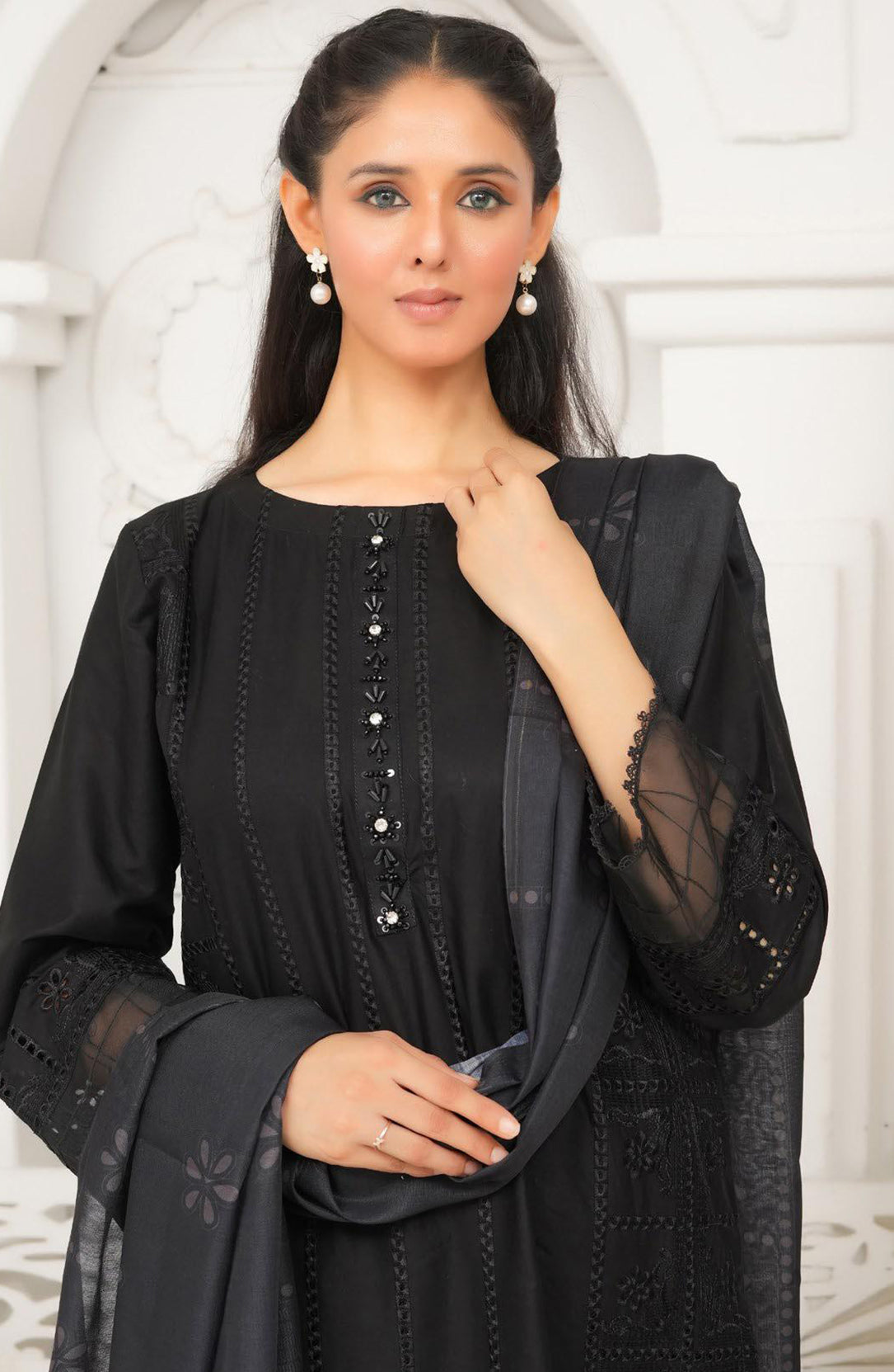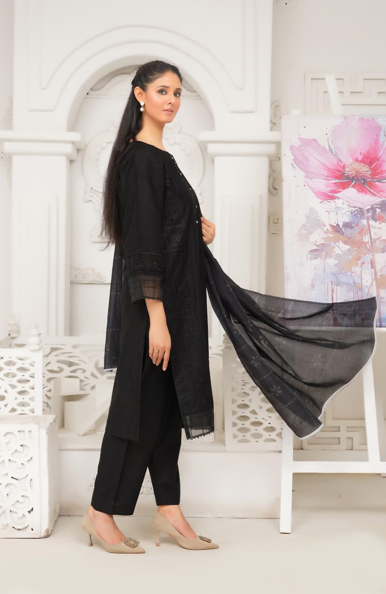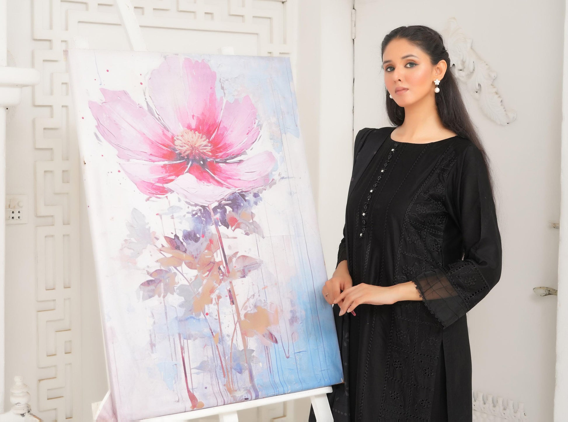A masterpiece of timeless elegance β Heer Noir embodies the allure of black with a touch of refined sophistication. Crafted in premium winter cotton, the ensemble features delicate tonal embroidery along the neckline and sleeves, enhanced with intricate cutwork and lace-inspired detailing that add depth to its all-black canvas. The sleek straight-cut trouser complements the design, while the lightweight dupatta, adorned with subtle woven patterns, brings a graceful flow to the look.