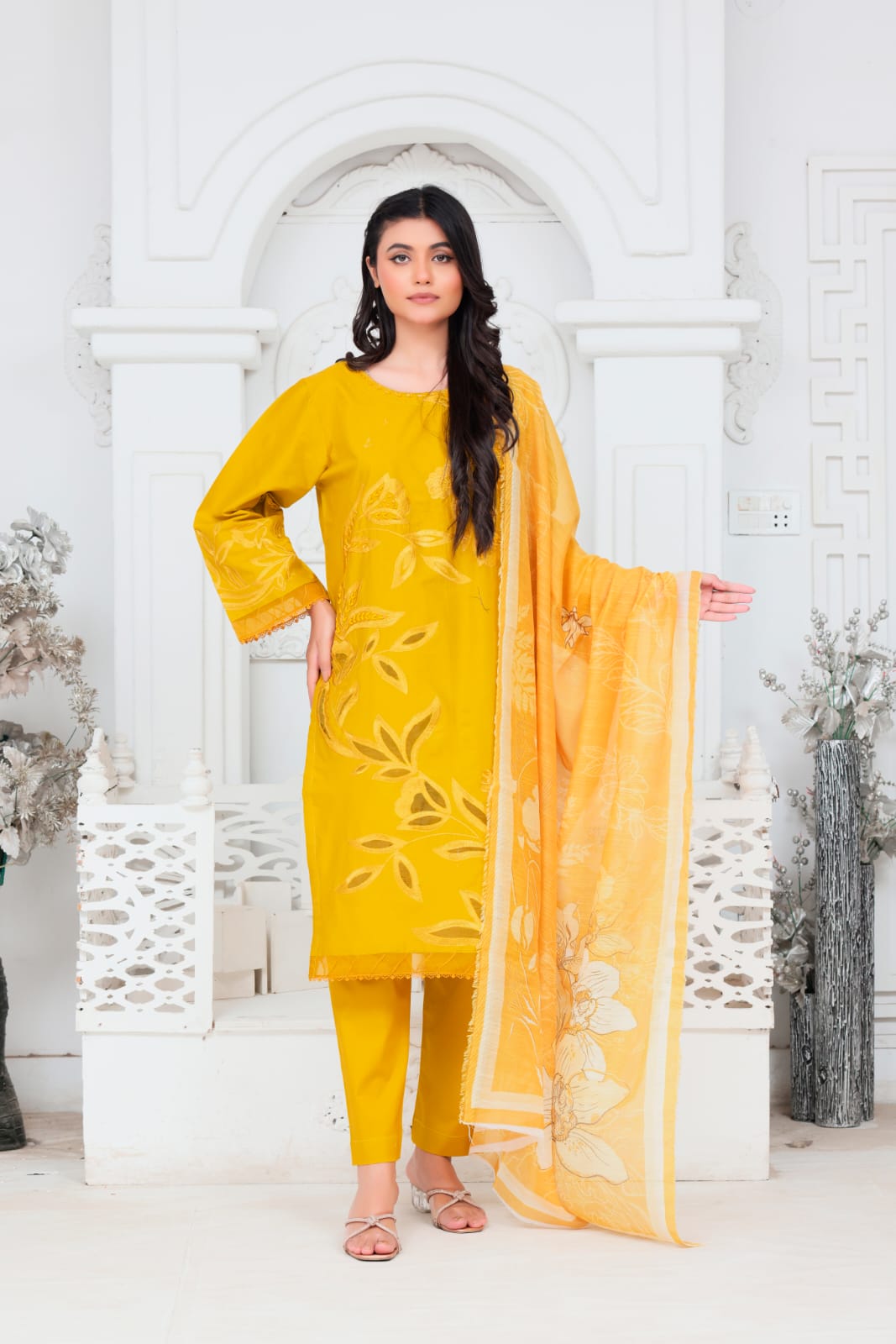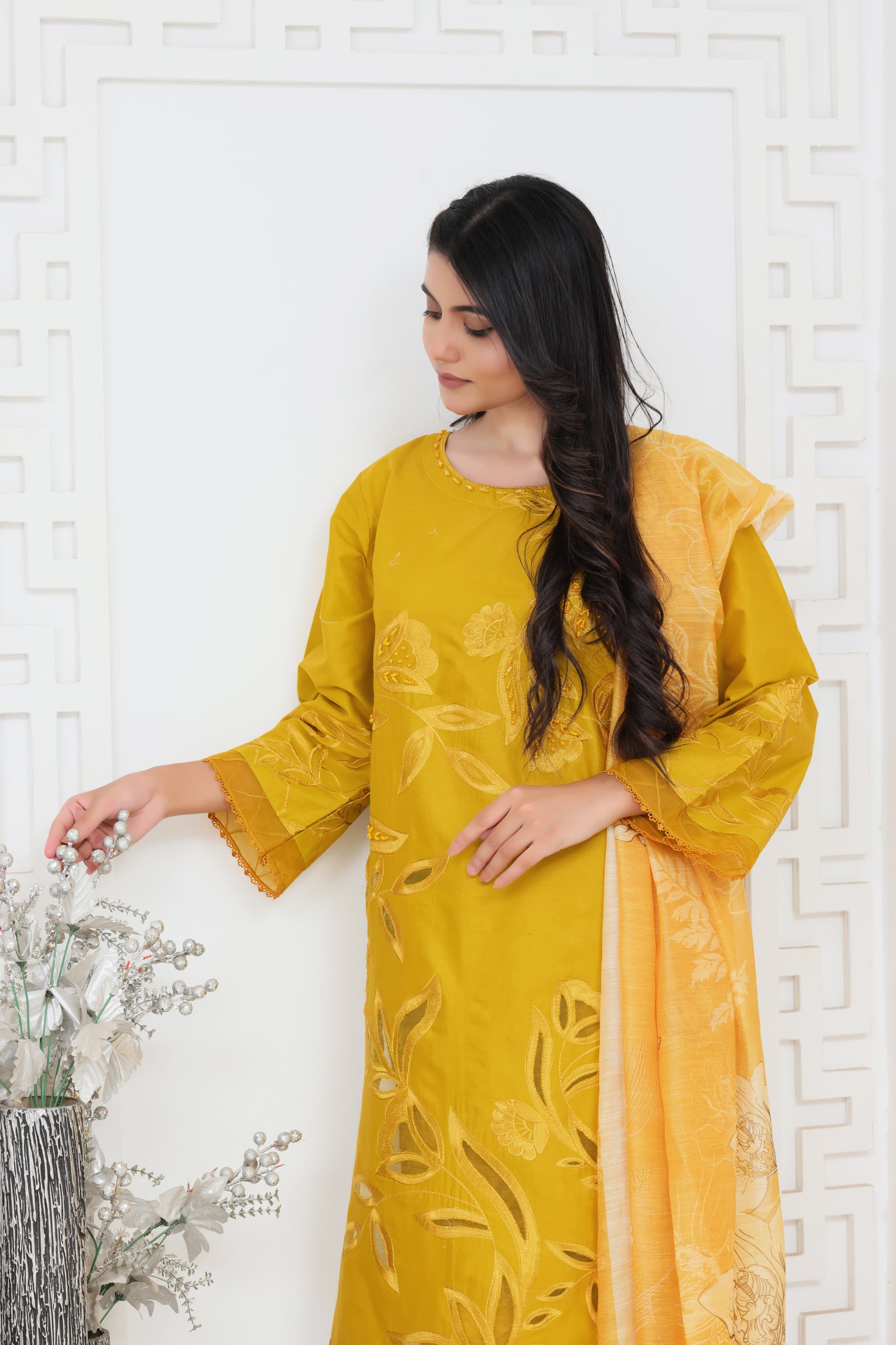 Intricate leafy cutwork on front, tailored straight trousers, delicate print dupatta, premium finish for all-day comfort