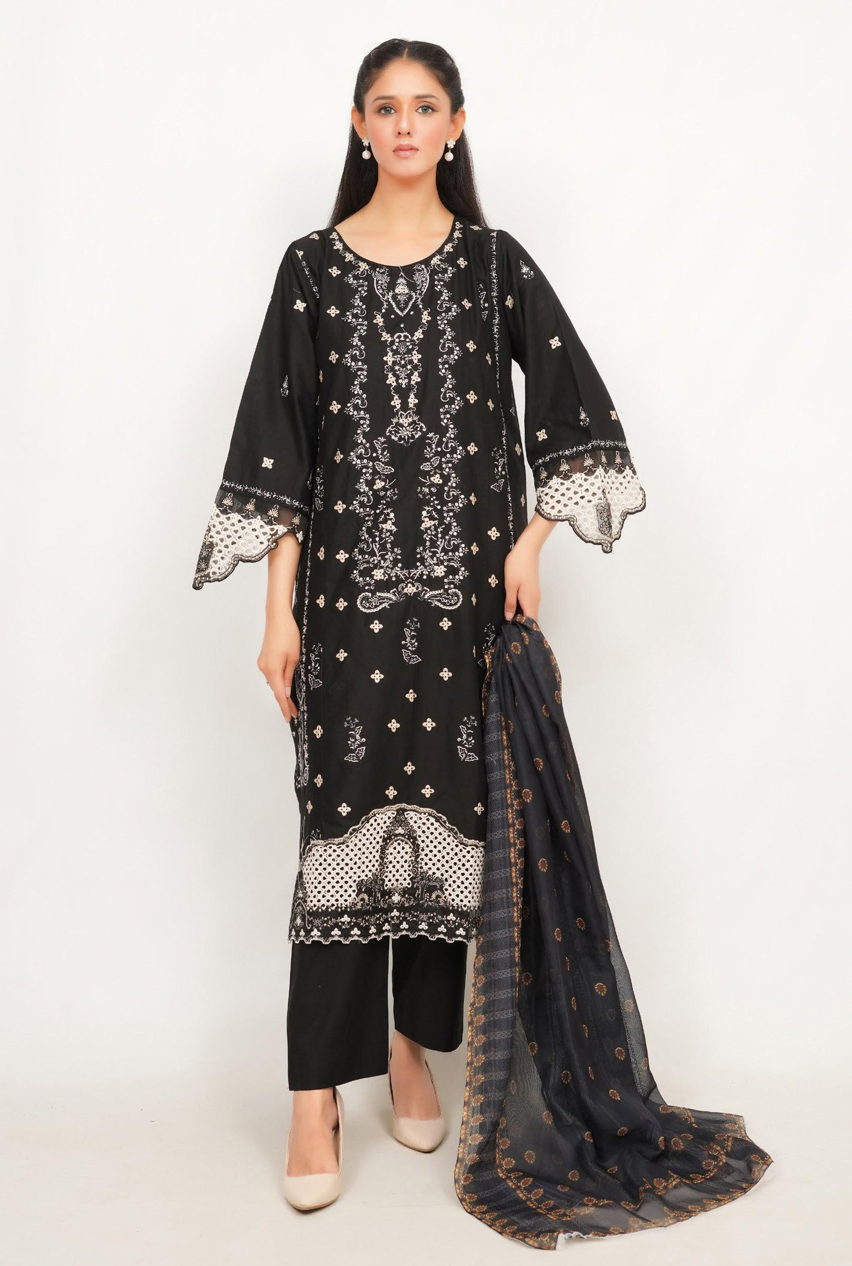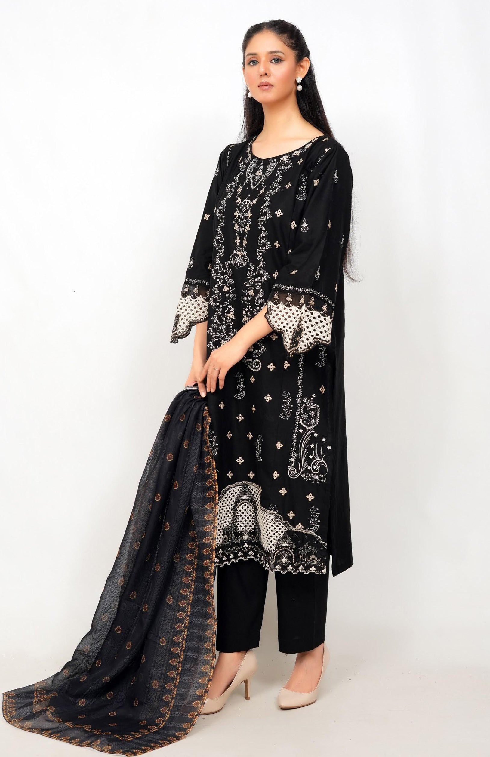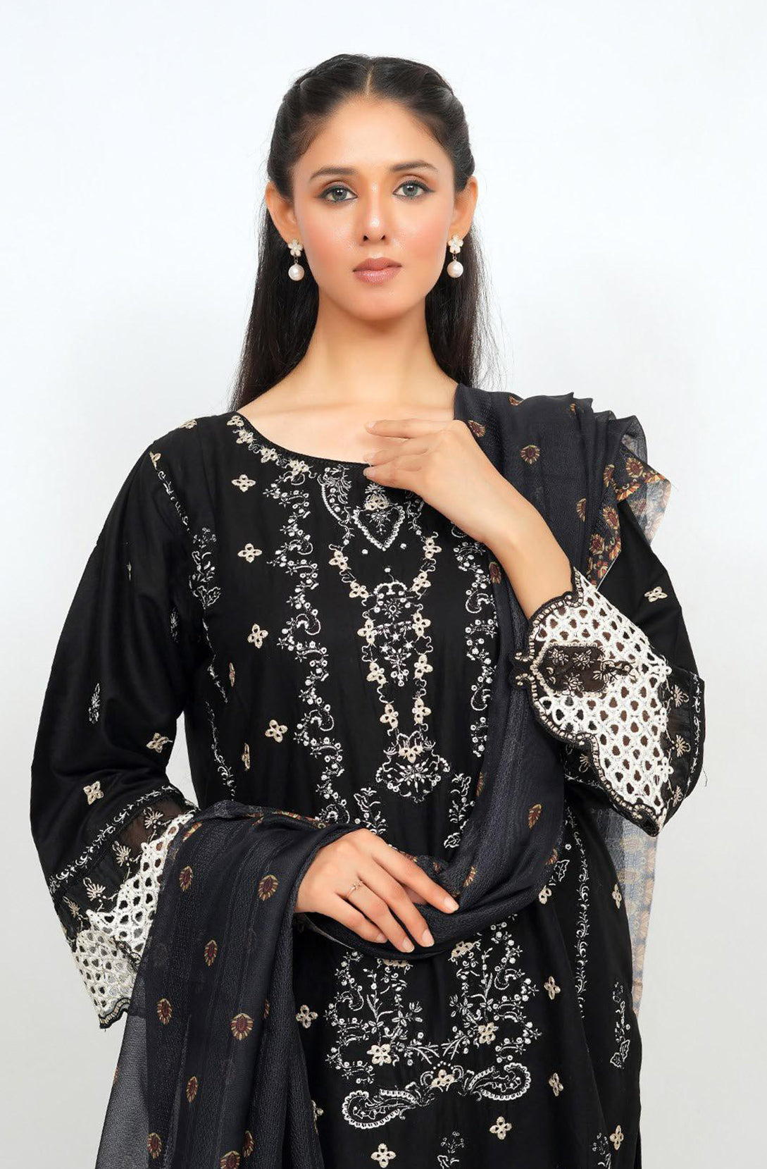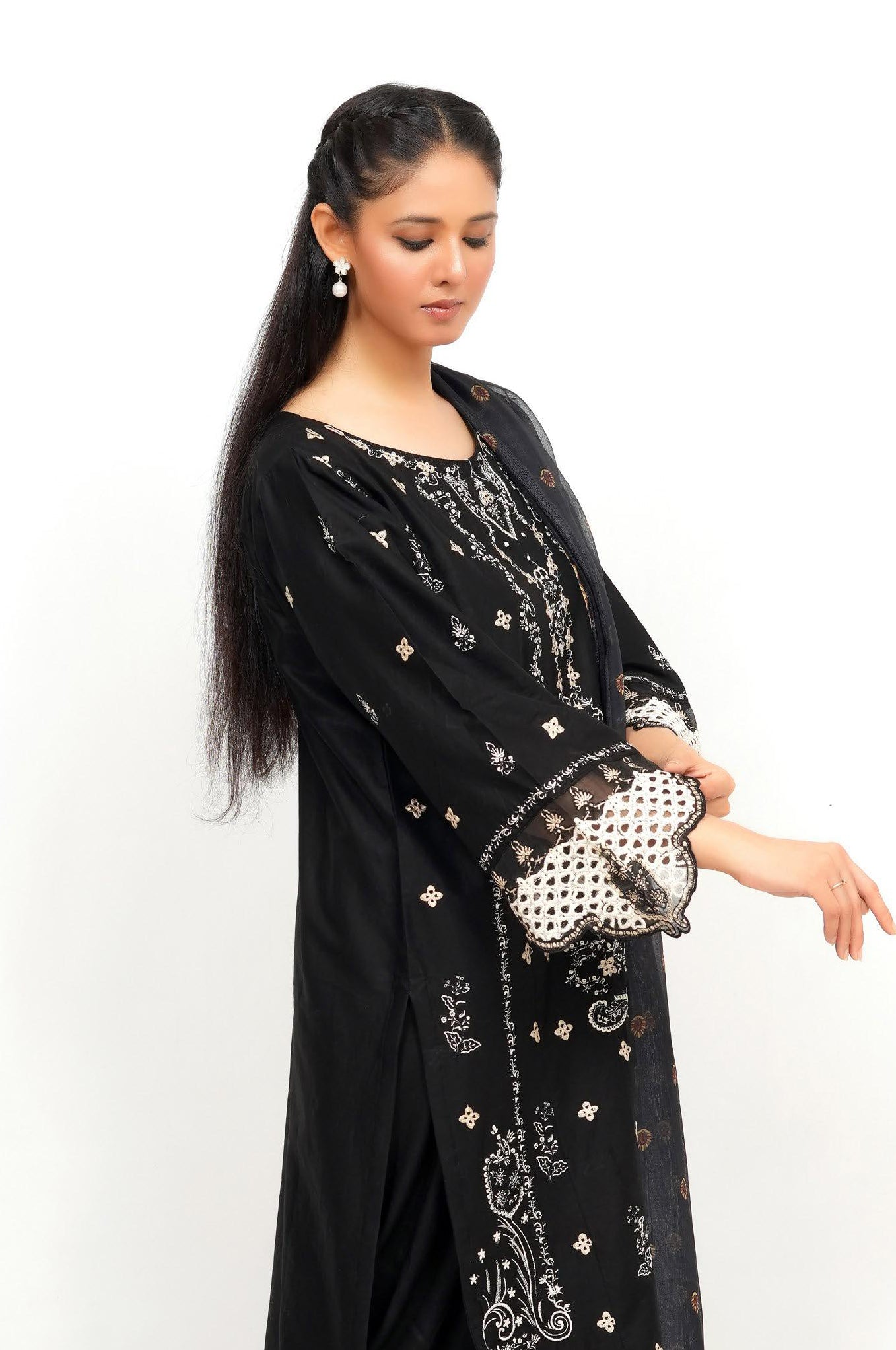 Celebrate divine elegance with Pari Aqsa, a mesmerizing black ensemble that embodies sophistication and subtle charm. Intricately embroidered with delicate white motifs, this timeless outfit strikes the perfect balance between tradition contemporary poise. The beautifully detailed neckline and lace-finished sleeves add a touch of softness to the bold black canvas, making it effortlessly captivating.