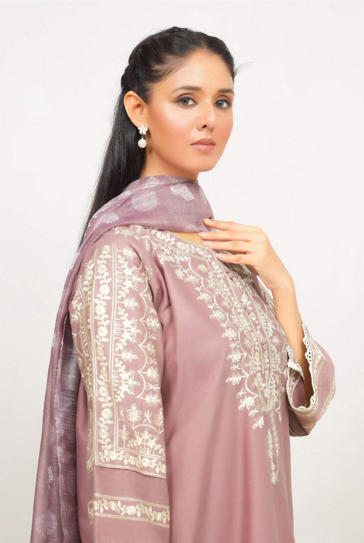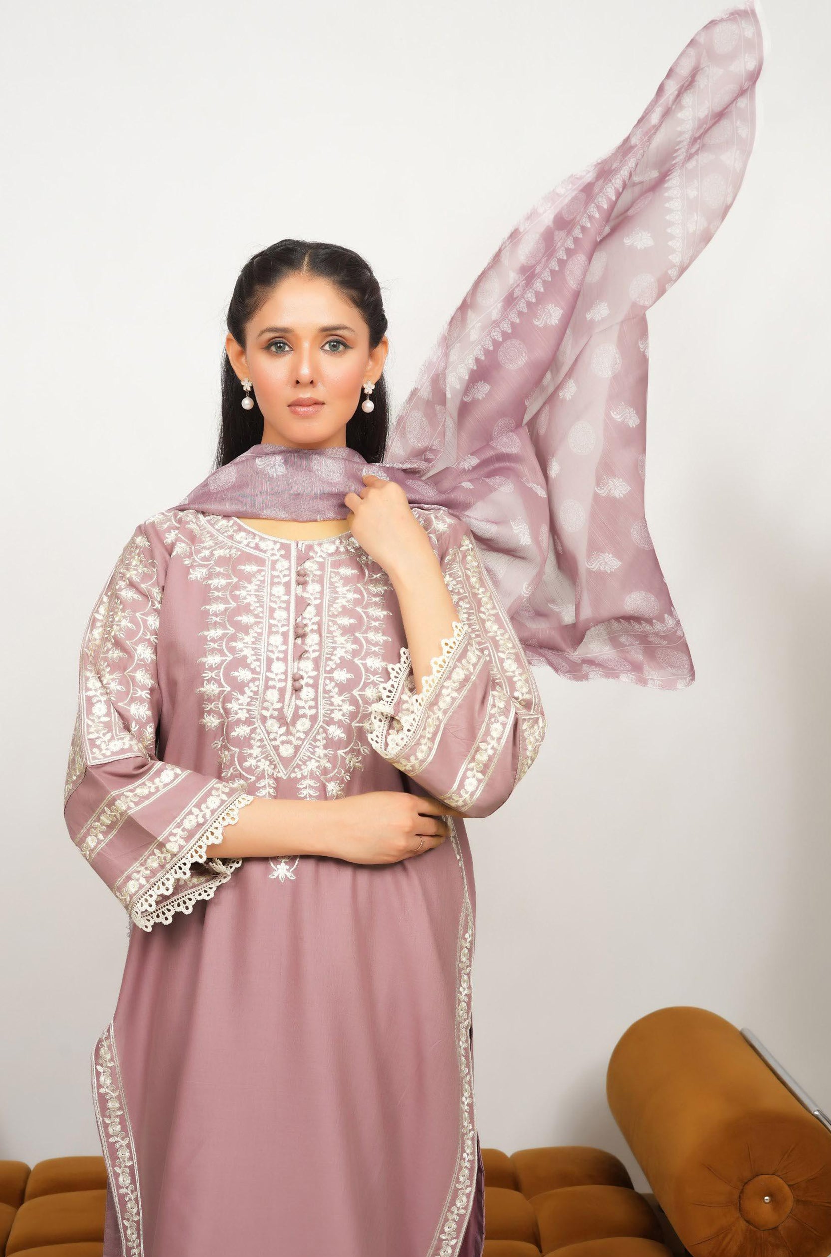 Presenting the elegant allure "Serenity" ensemble. this striking outfit radiates grace and timeless beauty. The soft, pinkish-purple hue exudes sophistication, adorned with delicate threadwork and intricate ethnic motifs, The beautifully embroidered neckline and wide, flared sleeves seamlessly combine traditional charm with modern flair. Styled with matching straight trouser and a digitally printed dupatta, Serenity offers the perfect balance of tradition, finesse, and comfort. A standout piece that will effortlessly enhance your wardrobe, ideal for any festive or semi-formal occasion.